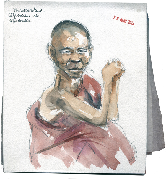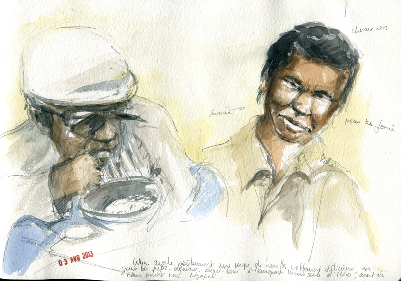 A quelques pas, une jeune femme lave son linge dans un baquet calé entre ses jambes. Joli sujet ! Se sentant observée, elle lève les yeux, gênée mais flattée tout de même, pataugeant dans sa lessive. Les hommes du village m’entourent pour commenter le dessin dans leur langue chantante, riant et pointant du doigt la malheureuse. Elle se prénomme Mwanivua.