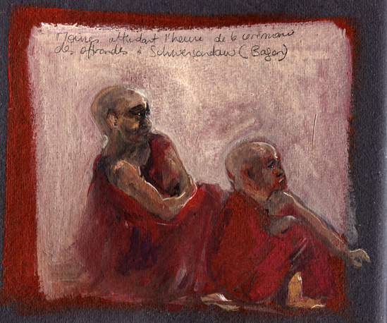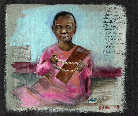 Dans l’urgence, je dessine le trio de Japonaises désœuvrées qui s’ennuient face à moi. Quatre sœurs indiennes m’accostent dans un anglais très épicé : « Oh, you’re a sketcher !!!! » Yes, indeed…