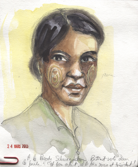 Les villageoises se méfient des esquisses à leur image. Je capte à la volée une silhouette féminine bien vite dissimulée, de temps en temps un portrait consenti.