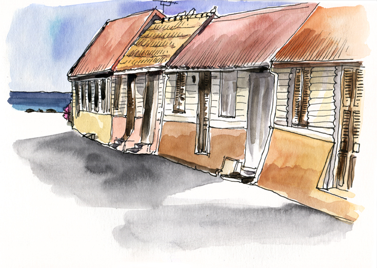 Pendant que Laurent se baigne, je m’installe dans la rue, attirée par cet alignement de petites maisons recouvertes de bois baignées dans la lumière. On aperçoit le bleu franc de l’océan, juste après la route. Pas un bruit, sauf les clameurs lointaines d’un défilé de carnaval.