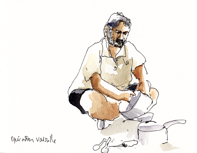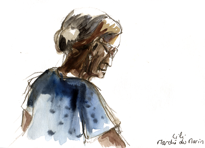 Je dessine de loin la marchande de rhum, assise en plein soleil. Arrivent trois enfants qui me regardent peindre avec de grands yeux plein de questions. Ils n’ouvrent pas la bouche, jusqu’à l’arrivée de leur maman avec qui nous discutons un moment. Yvan et Pascal parcourent les océans en famille à bord de leur trimaran La Ohana pour dénoncer les atteintes faites au milieu marin et à l’environnement. Un très beau projet que vous pouvez soutenir à cette adresse : http://fr.la-ohana.org/