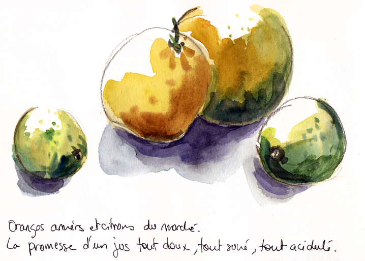 Une dame s’approche pour me proposer un tabouret. Elle s’appelle Lucia, ravie de reconnaître sur mon dessin sa maison, celle avec le rideau qui flotte au vent. Elle me raconte qu’elle et son mari Max viennent de rentrer en Martinique après toute une vie passée à travailler en métropole. Fait du hasard, ils habitaient juste à côté de mon atelier ! Le monde est tout petit… Là, ils finissent de retaper la maison familiale, celle que j’ai dessinée. Je repars avec un kilo d’oranges amères délicieusement parfumées. « Elles viennent directement du piton. Elles sont amères et douces. »