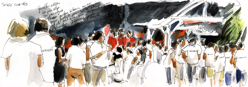 Nous rentrons nous préparer pour le cocktail Transquadra prévu ce soir au Club Med de Sainte Anne, partenaire officiel de la course. Je fais un superbe effort vestimentaire : petite robe noire, maquillage, lissage de cheveux, bracelet VIP pour montrer patte blanche… et en bandoulière mon affreux sac rouge avec mon carnet de croquis et mes affaires de dessin. Laurent me suggère alors de prévoir à l’avenir un « sac à croquis de soirée »… J’y songerai !