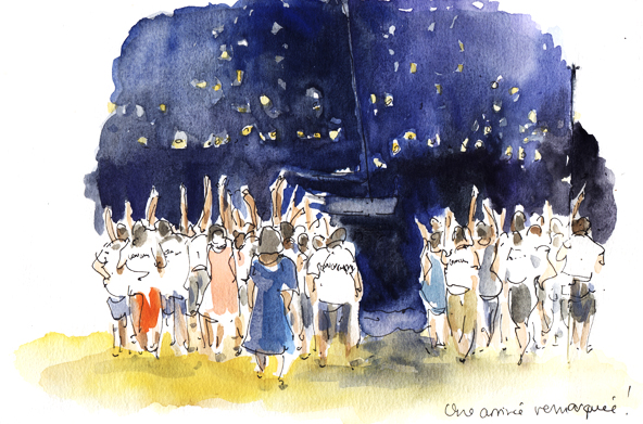 La cérémonie de clôture bat son plein avec un orchestre sympathique et tonitruant. Je dessine à toute vitesse, au rythme des percussions tandis que la nuit tombe. Belle ambiance de fête. Laurent semble nostalgique, de la buée au fond des yeux : une page se tourne, un beau projet qui l’occupe depuis bientôt 3 ans touche à sa fin.