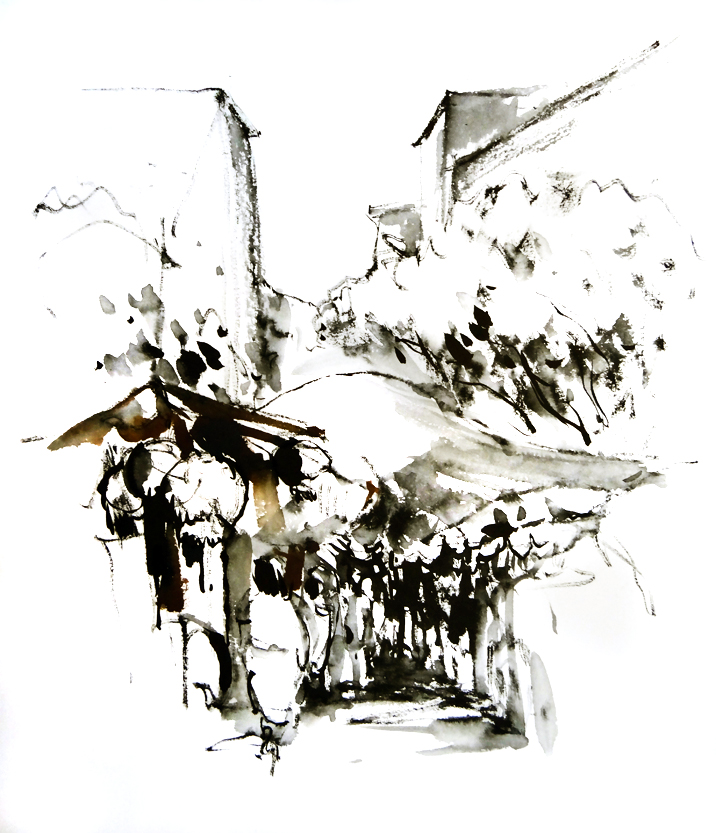 J’ai eu envie d’expériences nouvelles et d’explorations inédites aux frontières de l’abstraction et de coups de chaud au sens propre comme au figuré ! 40 degrés à l’ombre… Difficile de dessiner sagement quand les vibrations de la ville s’emparent du croquis. Alors, on se laisse emporter et chahuter, et on verra bien.