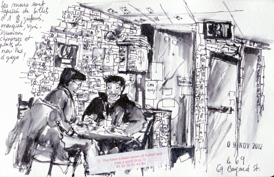 Nous dînerons le soir chez Zante (dessin de gauche), un diner de quartier tout près de notre hôtel, juste à la sortie du métro.