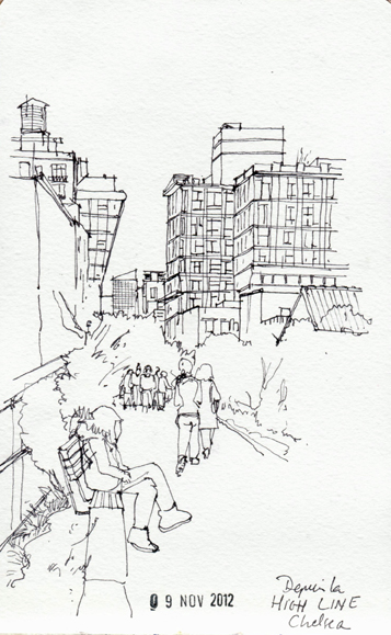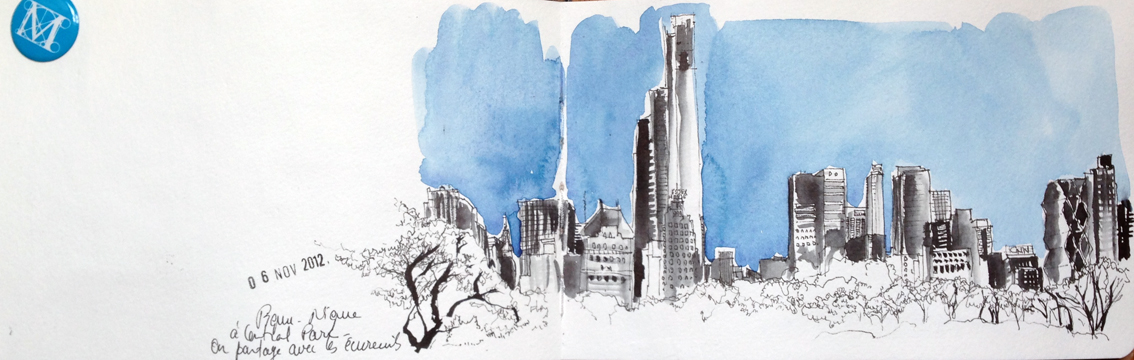 On décide de s’acheter une pita avec des falafels auprès d’un camion ambulant pour pique-niquer au soleil dans Central Parc. Claudia joue avec les écureuils (précision : l’écureuil n’aime pas la farine de pois chiches) tandis que je dessine le skyline en sirotant un thé vert brûlant dans son gobelet en carton.