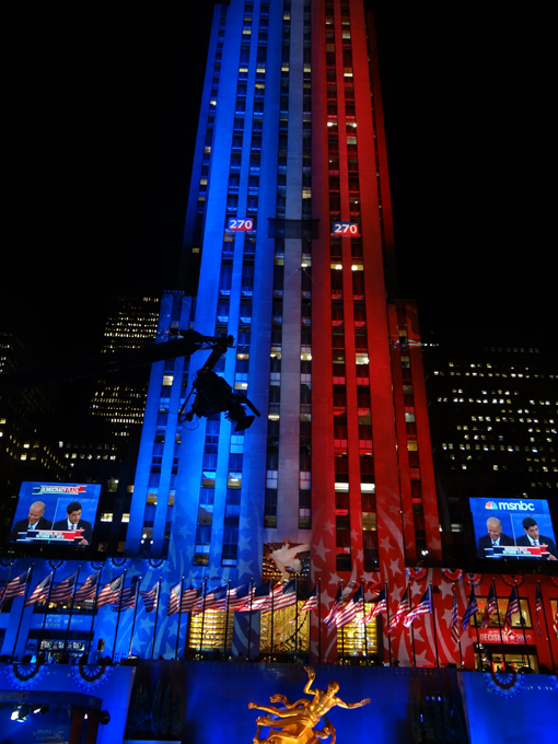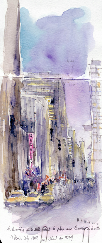 Ça y est : grand ciel bleu et Obama réélu. Une belle journée s’annonce… La veille, j’avais tout de même réussi à traîner Claudia sur l’esplanade du Rockfeller Center pour humer l’ambiance électorale. Pas de dessin (il faisait nuit, je n’avais pas dormi depuis 24 heures, mes doigts gelés ne se prêtaient pas au maniement du pinceau et Claudia m’aurait de toute les façons étripée après m’avoir fait manger mes aquarelles), mais une petite photo s’imposait pour immortaliser ce mo(nu)ment historique.