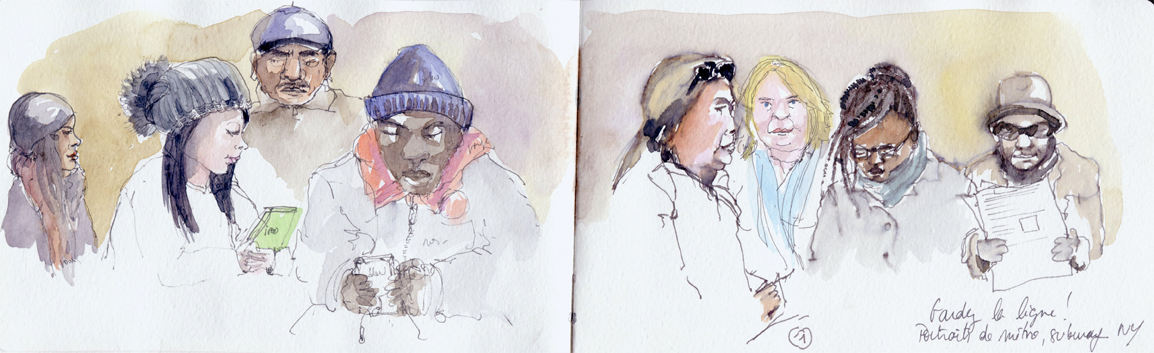 Nous nous déplaçons uniquement en métro : c’est le seul endroit où je suis capable de m’orienter facilement… J’en profite toujours pour croquer rapidement mes voisins de ligne. La meilleure façon d’avoir une galerie de portraits des « vrais gens ».
