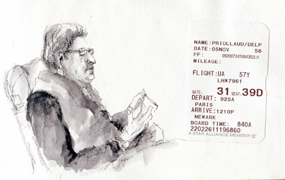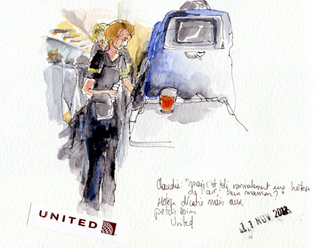 Nous embarquons sur un vol United, avec un équipage très sympathique, mais vieillissant… Il va sans dire que je peux me retenir de dessiner cette hôtesse adorable et toute ridée ; et de noter ce bon mot de ma fille : « Mais c’est jeune et joli, d’habitude, une hôtesse de l’air, hein maman ? »