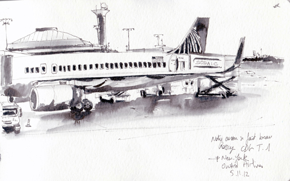 Le voyage démarre à Roissy, en salle d’embarquement : j’apprécie ces heures d’attente qui précèdent le « vrai » voyage. Je me projette, j’imagine, je savoure le voyage à venir. Et surtout, je ne vois pas le temps passer en dessinant les avions en préparation. Un aérien ballet…
