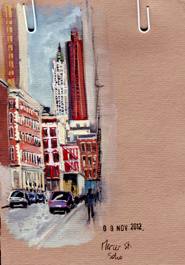 On enchaîne avec une petite perspective à la gouache des façades métalliques de l’Iron District : j’adore !
