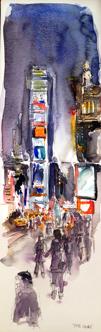A peine le temps de débarquer à Newark, de prendre le train pour Manhattan et de poser nos valises à l’Hôtel Vetiver : je recommande ce petit hôtel au rapport qualité-prix imbattable, situé dans le Queens, à 2 pas de la station de métro 39th Avenue. Justement, nous voici en 15 minutes à Times Square, le fantasme absolu de Claudia. Pendant qu’elle découvre les enseignes lumineuses et les boutiques (premier repérage : même jetlaggée, elle ne renoncerait pour rien au monde aux joies du shopping compulsif), j’enfile mes mitaines et dégaine carnet et aquarelles. Quel bonheur de retrouver NYC, la ville trépidante, le bruit, les lumières, les buildings. Mon dernier voyage là-bas remonte à 2008.