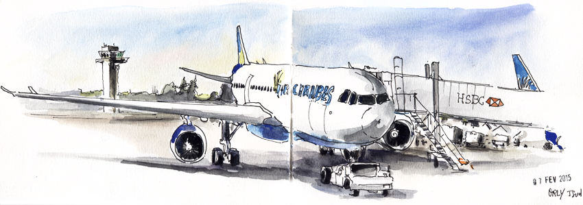 Je tue le temps en dessinant depuis une salle d’embarquement inondée de soleil. Air Caraïbes se fait une beauté sous un magnifique ciel bleu… et je suis enfin en vacances, pressée de découvrir la Martinique et rêvant de ti punch sous les cocotiers !
